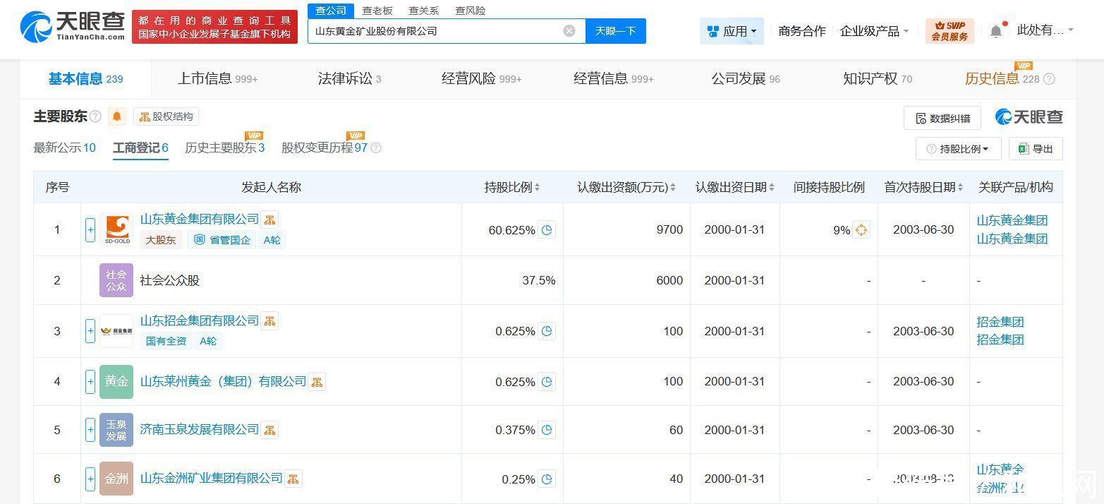 该公司成立于2000年1月,注册资本约44.73亿人民币,经营范围为批准许可范围内的黄金开采、选冶,黄金矿山专用设备、建筑装饰材料的生产、销售。股东信息显示,该公司由山东黄金集团有限公司、山东招金集团有限公司、山东莱州黄金(集团)有限公司等共同持股。